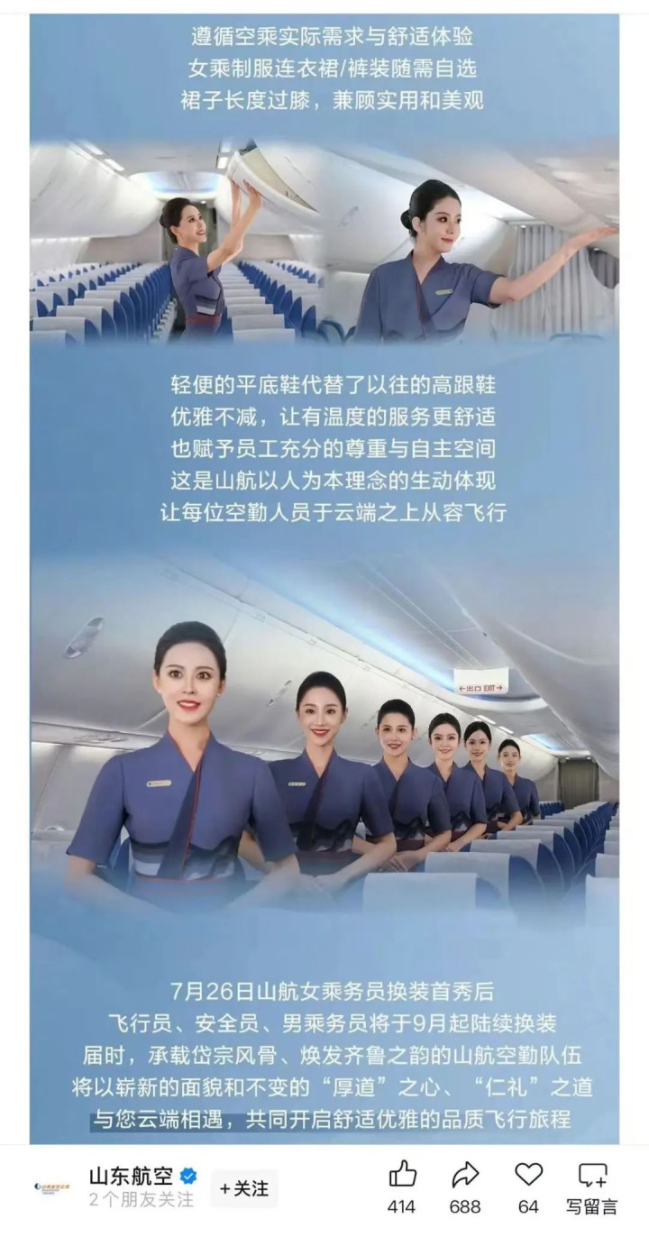 山东航空允许女性乘务员自选裤装或过膝裙、搭配轻便平底鞋,女乘务员的着装要求从符合“固定审美”转向“实际需求”,这体现了航司对员工职业健康与工作舒适体验的关注,值得肯定和推广。